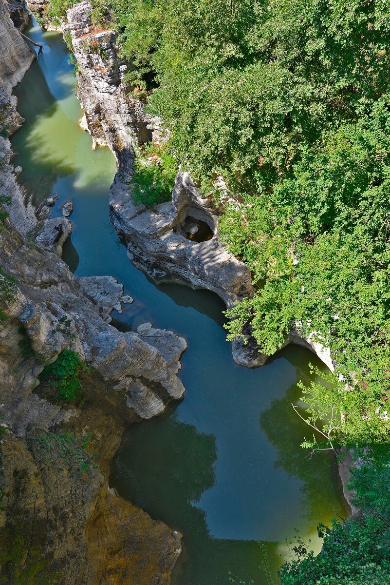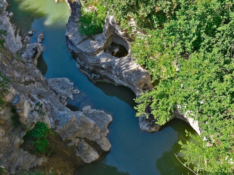 Una conformazione naturale affascinante, che il fiume Metauro pazientemente e inesorabilmente ha modellato nel corso dei millenni, giungendo a plasmare cavità rotondeggianti di varia grandezza, si trova in località San Lazzaro di Fossombrone e rappresenta l’unico canyon turchese delle Marche, le Marmitte dei Giganti, occupate da caratteristici specchi d’acqua che riflettono il cielo terso e azzurro e la vegetazione che fiancheggia le sponde del fiume. La marmitta ha una caratteristica forma a pentola provocata dalla potente erosione delle acque sulla roccia calcarea. Un lavoro lungo e faticoso; proprio per questo la leggenda vuole che siano stati dei giganti a plasmare tali affascinanti e uniche perle naturali. Alcune marmitte raggiungono dimensioni considerevoli vantando un diametro di 4 metri e una profondità di 6. I più temerari possono godere di questa meraviglia della natura percorrendo il sentiero che costeggia le rive della gola, ma chi volesse solo riempire lo sguardo e l’anima con questa onirica visione, può affacciarsi dal ponte di Diocleziano, meglio conosciuto come il Ponte dei Saltelli.