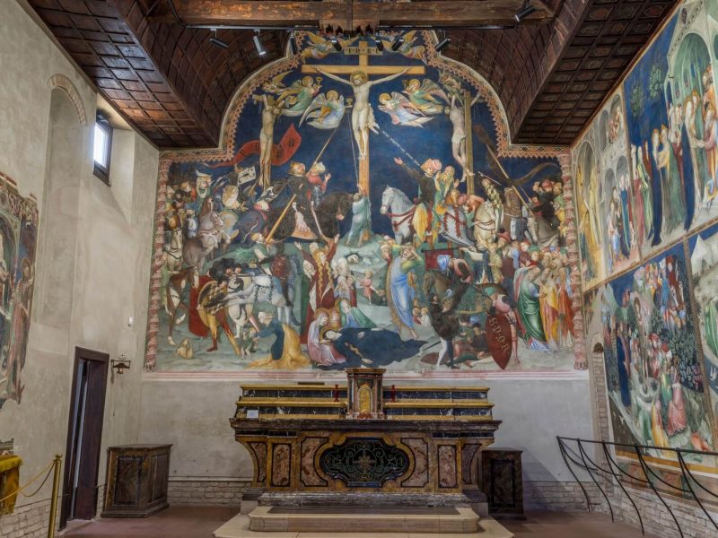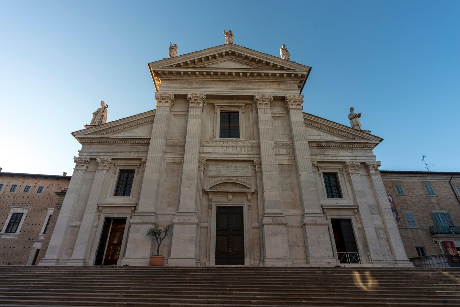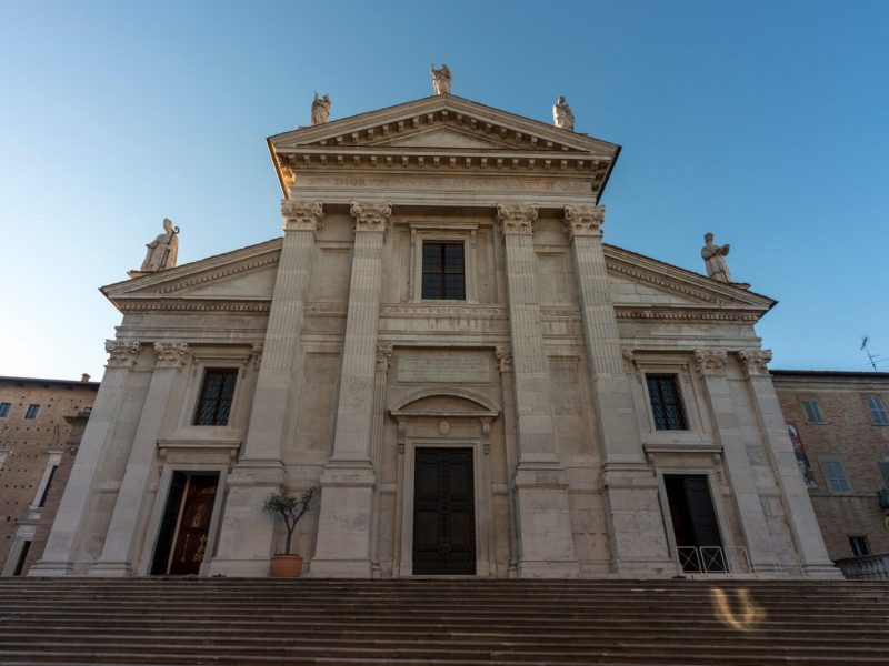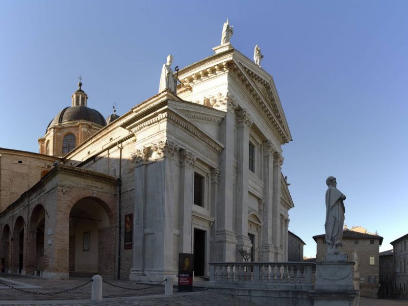 In certe giornate baciate dal sole, con l’azzurro cielo appena spruzzato di sfumature dorate di luce, trovarsi davanti all’ampia scalinata che conduce al Duomo di Urbino lascia interdetti a fronte dello spettacolo che ci si para davanti e dinanzi alla meraviglia e alla perfezione che l’uomo è stato in grado di raggiungere con la sua opera. La chiesa, dedicata a Santa Maria Assunta, s i innalza nel cuore storico della città, a fianco del Palazzo Ducale. Sull’imponente facciata, che contrasta con i colori dei mattoni degli edifici circostanti, si ergono sette maestose statue: si tratta delle tre virtù teologali (Fede, Speranza e Carità), dei Santi Giovanni Crisostomo, Agostino, Crescentino patrono e del Compatrono Beato Mainardo. È d’obbligo spendere qualche parola su altre due eccellenze del panorama culturale urbinate, ovvero l’Oratorio di San Giovanni e l’Oratorio di San Giuseppe. Il primo, definito dagli urbinati “una piccola cappella sistina” è lo scrigno di un gioiello pittorico dipinto dai fratelli Lorenzo e Jacopo Salimbeni: si tratta di un ciclo di affreschi datato 1416 che oggi, dopo oltre sei secoli, mantiene tutto il suo splendore e i suoi fulgidi colori. La Crocifissione e la Storia di San Giovanni Battista assurgono al titolo di veri e propri capolavori: anche l’occhio più distratto non potrà che rimanere basito di fronte all’espressione di dolore, alla fronte corrugata della Madonna, alla precisione con cui i diversi tratti di colore sfumano gli uni sugli altri. L’Oratorio di San Giuseppe conserva invece uno scenografico Presepio in stucco del 1560, realizzato da Federico Brandani. Si tratta di un’opera unica ne lsuo genere, ove i personaggi della Natività assumono fattezze naturali: la cura minuziosa dei particolari e dei dettagli si sposa aglie ffetti rilasciati dalle luci che provengono dall’alto; a fine giornata sorgenti luminose vanno a cadere sul bambino, facendolo così brillare di energia propria e realizzando a pieno quella magia che solo una rappresentazione della Natività riesce ad avverare.