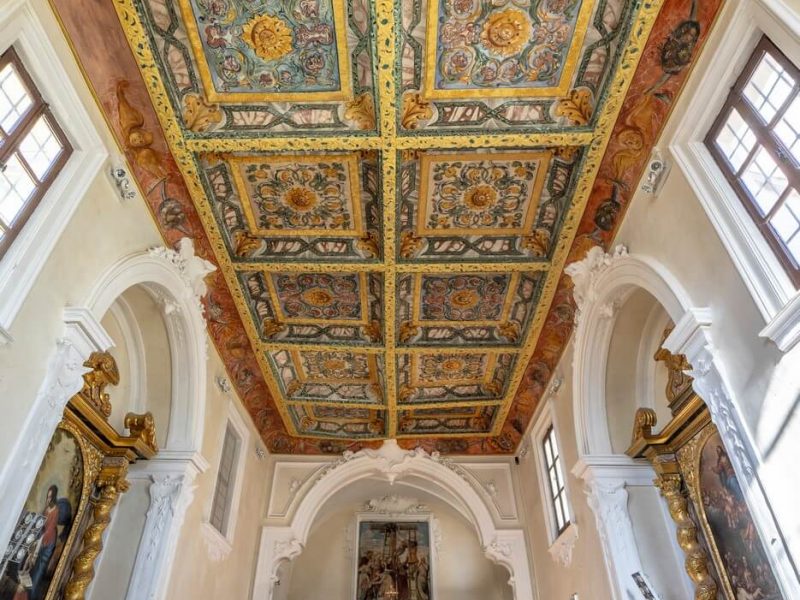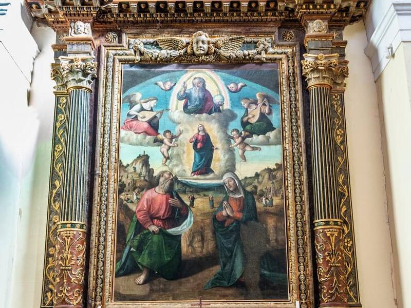Presenti anche una bellissima tela della scuola del Perugino, la Deposizione della Croce, e un soffitto a cassettoni con stuccature in gesso dipinte a mano. All’interno della chiesa, oggi usata come sede di eventi culturali, sono inoltre conservati dei bellissimi mosaici appartenenti ad un’antica domus romana. Tra le altre chiese a Saltara colpiscono lo sguardo l’imponente facciata arancione di Celestino, che si impone alla vista appena si giunge al paese, e l’affresco del Bellinzoni nella Chiesa della Fonte, osservando il quale sembra d’immergersi in una corte rinascimentale.