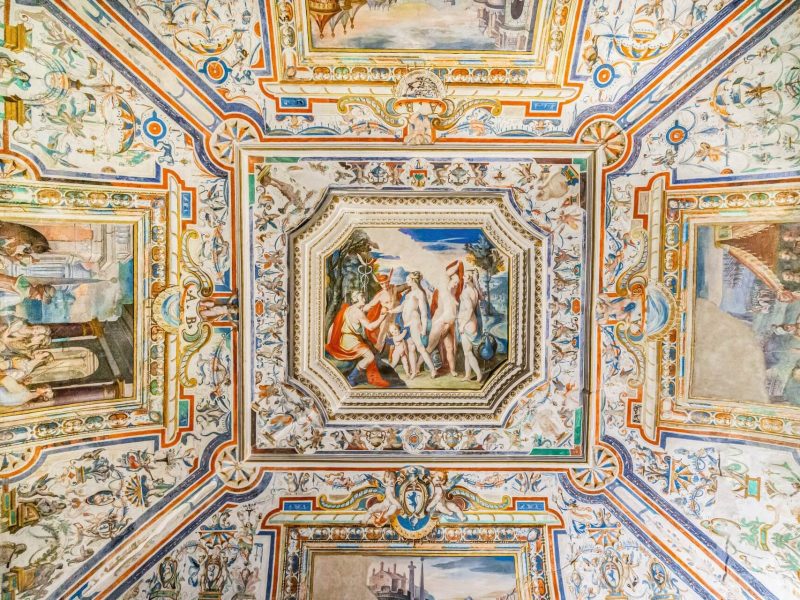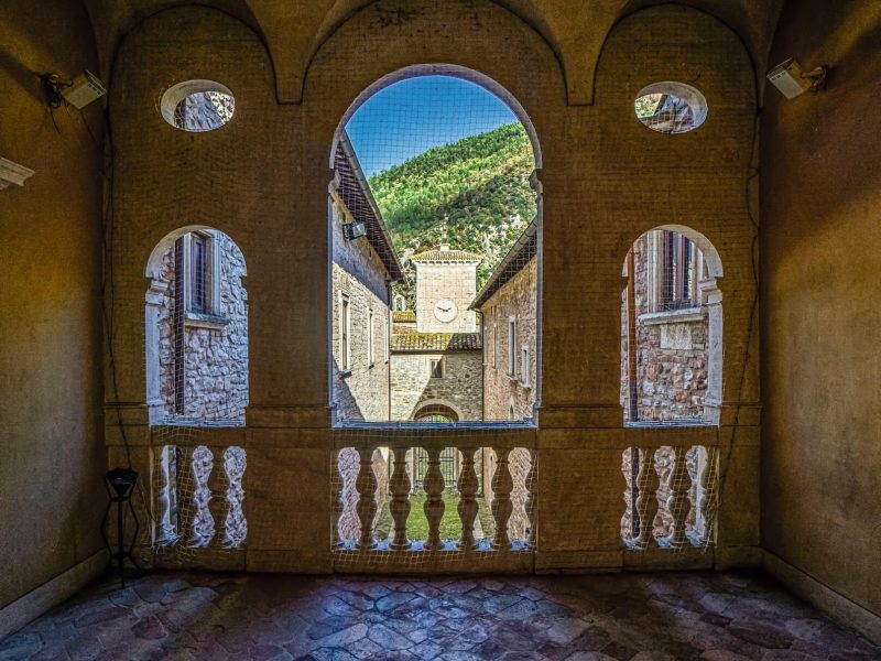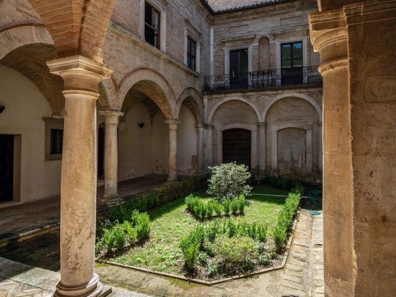 Cultura greca, latina e volgare italiana si mescolano, così come lo stile medievale, quello rinascimentale e quello barocco si fondono nel maestoso e ammaliante Palazzo Brancaleoni (attuale Castello) che, con le oltre sue 135 stanze, è testimone di intrighi e scrigno di segreti. Un palazzo che è una vera e propria fonte storica: se anche fossero andati perduti i documenti che testimoniano la sua storia, questa potrebbe essere ricostruita dalle date e dai nomi che sono riportati nella parte superiore di ogni finestra e all’estremità di ogni portale. Iniziato a costruire nel 1200, il Castello si contraddistingue innanzitutto per il portale d’ingresso costruito in travertino, opera dell’architetto Genga, su cui spicca il leone rampante sotto la croce distesa, stemma dei Brancaleoni e simbolo dell’appartenenza della famiglia ai cavalieri di Malta. “Praos kai tolmeros”, “mite e fiero” è il motto dei Brancaleoni sullo stemma, anche se la mitezza non scorreva propriamente nel loro sangue. Dal suggestivo corridoio a cielo aperto, percorrendo il quale, come sfogliando un libro di pietra, si possono notare finestre e portali riportanti incisioni in greco, latino o volgare, si accede al cortile rinascimentale e, successivamente, alla stanza delle torture e dei trabocchetti (caratteristico lo sprofondo in uno spigolo della stanza circondato da lunghe e affilate lame di coltello, ove spesso precipitava l’ignara vittima, qui rinchiusa al buio). Percorrendo la scala principale del Castello, oggi ricostruita perché consumata per i tanti passaggi, ma col corrimano in travertino originale, si accede all’appartamento nobile, con la Sala Leon d’oro, così chiamata perché si narra che, un tempo, vi fosse davvero conservato un leone d’oro. Qui fanno bella mostra di sé degli stucchi in oro del pittore Federico Brandani, attivo anche nel Palazzo Ducale d’Urbino. Proseguendo il tour e inerpicandosi per il labirinto del maestoso Castello, calpestando il pavimento in originale cotto, arriviamo alla Camera Romana, la stanza della Contessa, abbellita da affreschi raffiguranti scene dell’antica Roma e da stucchi opera del Brandani; poi la camera del Conte Antonio II, conosciuta anche come Camera Greca, uno studiolo di meditazione con affreschi raffiguranti episodi del vecchio testamento. Tutte le opere pittoriche, restaurate circa 40 anni fa, presentano colori vivi e vivaci. Affacciandosi al balcone spunta da lontano l’orologio della torre, costruito nel 1610, caratterizzato da una particolarità: il lato verso il borgo mostra normali numeri romani, all’interno del palazzo, invece, i numeri sono rovesciati e le lancette scorrono in senso antiorario. Dulcis in fundo, dal reparto cucine si può ammirare l’ineffabile fuga di porte lungo la quale lo sguardo sembra perdersi all’infinito.
