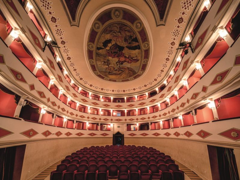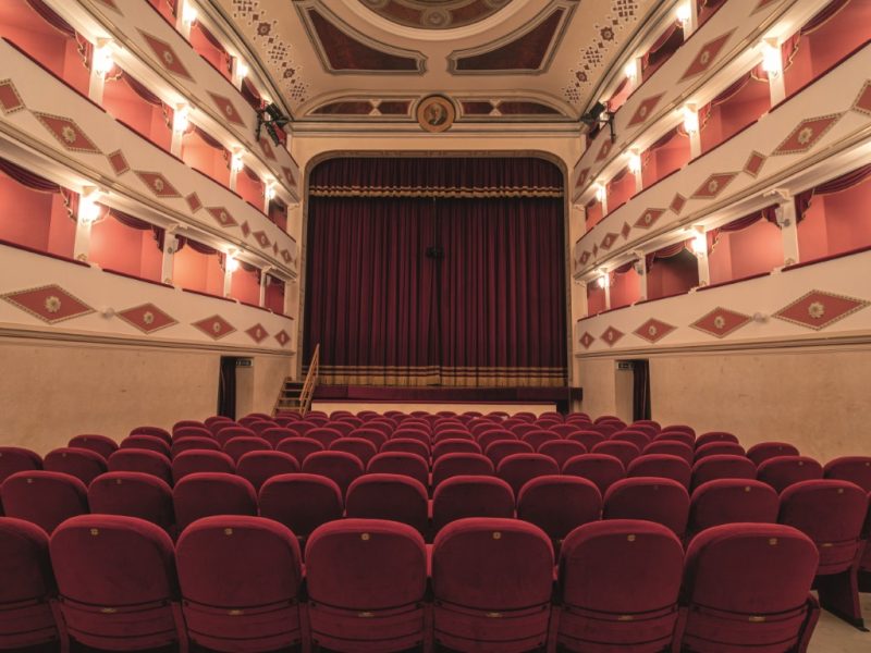 Il Teatro Battelli è un tempio dell’arte, la cui architettura canta l’ode all’ottocento con i suoi palchi a ferro di cavallo e le sue decorazioni in stucco, un retaggio di quell’epoca che ancora oggi incanta e meraviglia. Nel suo interno, i dettagli novecenteschi si fondono con il gusto liberty, come nel grande ovoide che domina la volta, dove un’immagine simbolica di Macerata Feltria ascolta il divino Apollo, in una rappresentazione che è quasi una preghiera dipinta, una richiesta di eterna bellezza e ispirazione.