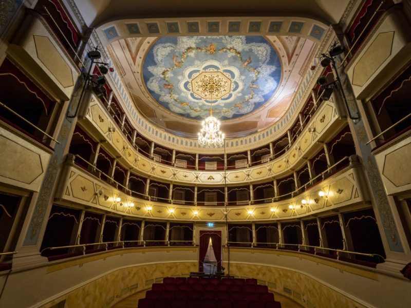 L’atmosfera suggestiva delle mura medievali illuminate dalle zucche offre un’esperienza unica, celebrando la capacità della comunità di innovare senza perdere il legame con le sue radici. A completare il panorama culturale della città, il Teatro Carlo Goldoni si erge come simbolo della vivacità artistica di Corinaldo. Costruito tra il 1861 e il 1869, questo gioiello ottocentesco con platea, tre ordini di palchi e loggione, rappresenta un luogo di aggregazione e innovazione culturale. Restaurato con cura, il teatro ospita una ricca stagione di spettacoli, eventi e mostre, intrecciando tradizione e modernità.
