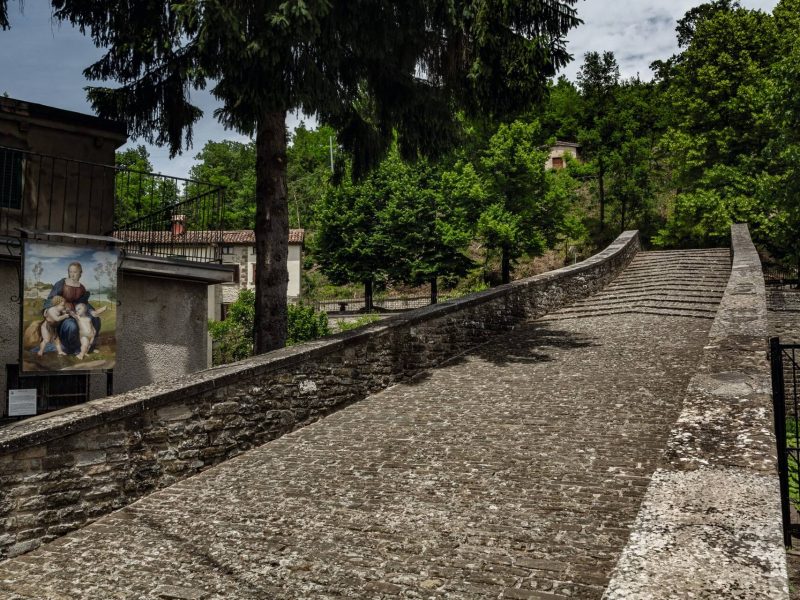 Apecchio is inexhaustible. While exploring it, we realize that there is no break in the interesting things we can admire. How can one not be pleased, at the arrival, while crossing the Biscuvio river on the “donkey back” bridge, a typical medieval work represented here in a most picturesque way? They say that the impression of serenity evoked by this corner inspired Raphael when he painted his Madonna with a Goldfinch, on whose background there is a bridge whose shape matches the Apecchio one. In the city centre houses, alleys and palaces open like books and tell the town’s history. We find the synagogue, the oven and the court where they celebrated Sukkot, the holiday of the tabernacles, and do so learn about the story of the Jew community that lived here since the end of the XV century. The Vicoletto (narrow alley) not more than 42 centimetres wide, which makes it one of the narrowest in Italy, is a memory of the smart way the Jews found to evade a heavy tax the