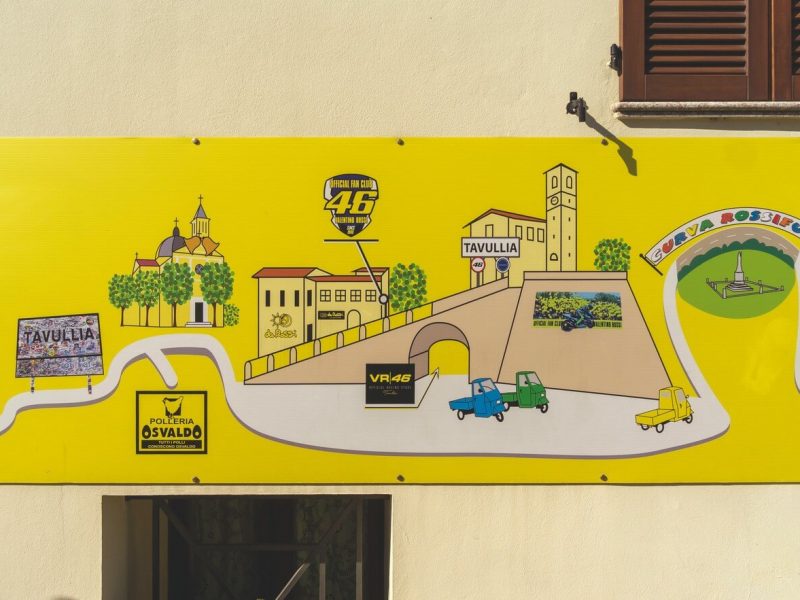 The city walls were instead covered with enlargements of unreleased photographs, creating an open-air museum which shall inspire all lovers of motorbiking. The same inspiration which led Franco Morbidelli to come to Babbucce, a borough of Tavullia’s, to make his dream come true and defy his Idol Valentino. After he came here, Tavullia can boast it hosts three Motorcycles Grand Prix aces: further to Morbidelli Rossi, of course, and his stepbrother Luca Marini. Young pilots grow up together in the VR46 Academy, based in Tavullia, and train screeching their tyres in nearby Valentino’s Ranch. Furthermore, into the circuit of the Ranch takes place every year the “100 kilometres”, a couples competition joined by champions from all over the world. Talented bikers blossom and mature and the number of fans grows along. To honour Morbidelli, in 2019 an Official Fan Club was created in Babbucce. With the typical enthusiasm of the young, it organizes events, offers merchandising gadgets and assembles fans. They are all pushed by the same passion for motorbiking which in Tavullia infects all boys, who grow dreaming they will emulate their heroes.