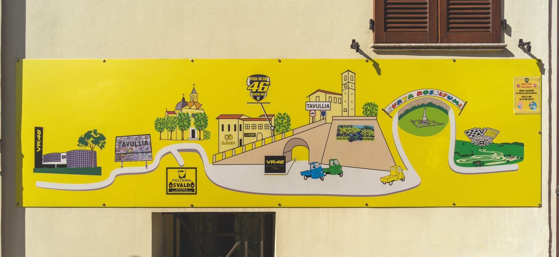 Like many other great things, the Official Valentino Rossi Fan Club was born in Tavullia almost as a joke, out of a wish to have fun. By now, so many years after 1997, when its official birth was declared, it is the most enduring sport fan club in the world and one of the most loved. It created innumerable skits and funny scenes to celebrate Rossi’s victories. It is a band of friends whom thousands of fans joined to create the “yellow people”, who thanks to the work and the organization of the Fan Club offer a show with every race. Further to his talent, also loved are Valentino’s fondness, sincerity, Gascon humour: the man before the champion, as is shown by the fact that the number of his fans kept growing in the last years. It is an important sign for the Fan Club too, as it is now busy with a “second stage” of its existence, oriented to keeping the Doctor’s story alive and offering new emotions and Tavullia is at the very core of the project. The city is the destination of a sport pilgrimage by tourists from all over the world, as is testified by the innumerable graffiti and stickers which cover the road signs bearing the city’s name. The “Yellow Park” is now being set up here, near the headquarters of the Fan Club. It will be a dedicated green area, with games and activities which shall take place between original objects used for the most famous celebration gags, such as the legendary one involving the Polleria Osvaldo (Osvaldo’s chicken farm).