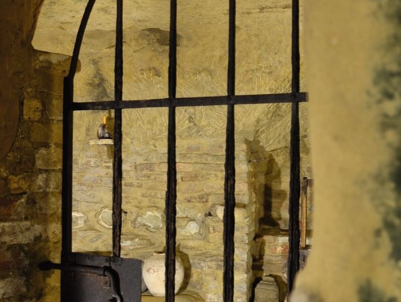 The bells tolled regularly, in ancient hamlets, and diffused reassuring notes that marked the day at regular intervals. In Gradara two bells toll in two very different places, both tied to its sacred and profane history. In the Historic Museum, a miniature bell only vibrates when touched in the right place with a little coin. According to the tradition, if the toll comes then the visitor will get great luck. The bell is the last stage of the visit to a museum which retraces some of the most sadly typical practices of a time when violence was the first way to solve a dispute. Close to an exhibition of ancient weapons, which includes throwing machines and scale model catapults, there is also a collection of faithful reproductions of instruments of torture, which were used to extort confessions even from the most honourable knights, consisting of whips, picks, Procustes beds and pointed chastity belts. From the museum it is also possible to get to a section of the many caves cut into the Gradara subsoil. They were used as hideaways during the incessant battles, but also to celebrate pagan rites forbidden by the Church. And it is a very ancient church, St. John the Baptist’s, lying beneath the Castle, that hosts the second bell, a normal one, which may be played by visitors, who can thus know how it feels being a sacristan. Inside the XIV century façade, there is a beautiful wooden crucified Christ, whose face bears a peculiar prospective: moving right to left to three carefully marked position, at first it looks like the suffering Christ were speaking some words, then as if he was falling into a state of fatal agony, and finding at last a peaceful expression in the rest of death. Friar Innocenzo, who created this beautiful work, meant perhaps to allude, by sculpturing it in the wood, to the sacredness and the mystery of the Christian Trinity.
